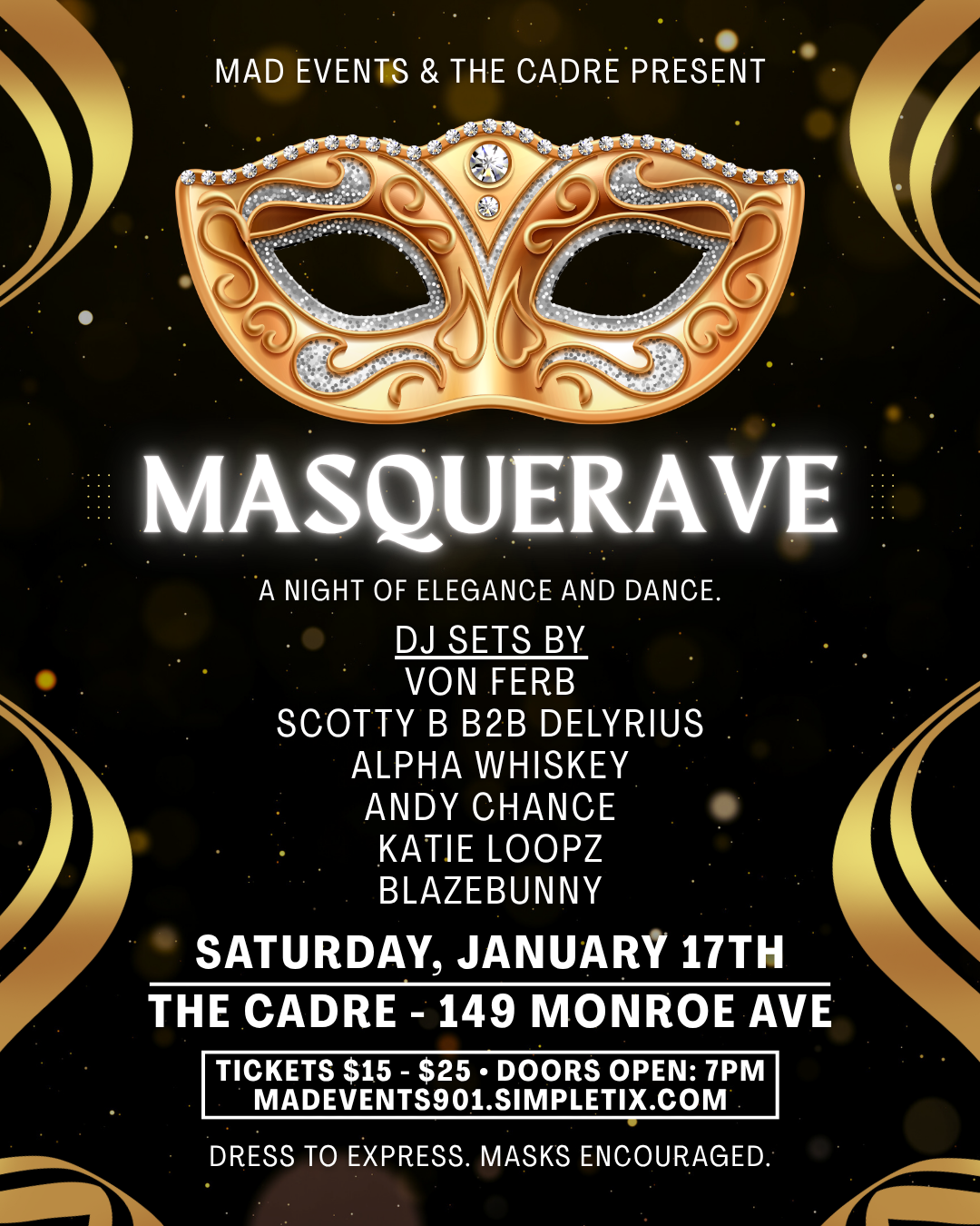 MAD Events returns to The Cadre Building in Downtown Memphis on Saturday, January 17th for 🎭 Masquerave, a night of elegance and dance brought to life with music, energy, and immersive visuals all night long!